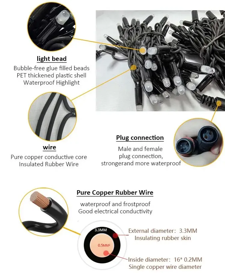 The string lights are built with high-quality rubber insulated cables that improve durability and flexibility. Compared with ordinary PVC cables, rubber cables provide better resistance to cold temperatures and outdoor environments.